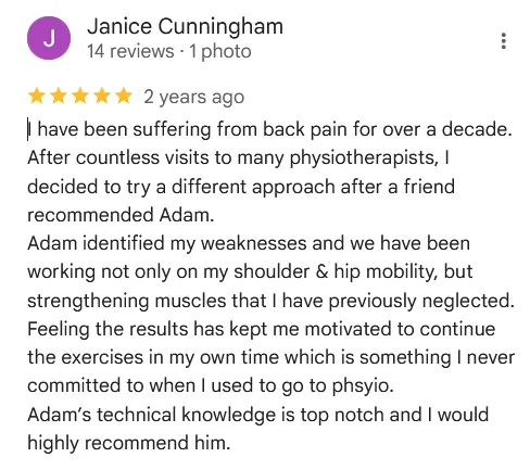 "I've been training for 15 years and have worked with countless physiotherapists for various injuries over the years. Adam is absolutely one of the best. I've never met anyone who understands the root causes of every problem and injury so well and delivers amazing results in every session. He's a competitor himself and understands injuries much better than any other physiotherapist I've met. If I had to describe his work in one word, I would say outstanding."